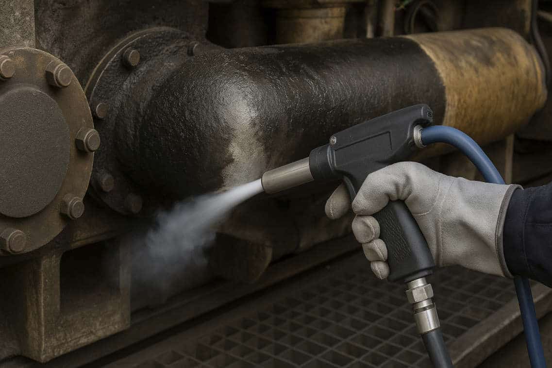 Reinigungsprozess: Das Strahlgerät wird mit Trockeneis befüllt und unter Druck betrieben. Der Bediener führt die Düse gleichmäßig über die Oberfläche.